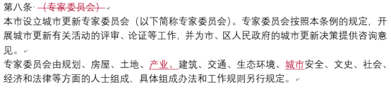 草案中已经着重强调产业内容,“产业”在草案稿中出现23次,其中第四十八条为专门的“产业转型升级引导”方面的内容。此次正式稿中在保留原先内容的基础上,又在多处添加了产业内容,比如城市更新的工作职责中加了“产业转型”的内容,专家委员会成员中加了“产业”方面的专家,在标准保障和用地保障中均加入了因“产业转型升级”给予相关保障等。