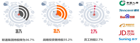 一是形成多元化股权结构。原控股股东联通集团持股由62.74%缩减至36.7%,但仍是控股股东;中国人寿、腾讯信达、百度鹏寰、京东三弘、阿里创投、苏宁云商、光启互联、淮海方舟、兴全基金和结构调整基金将合计持有中国联通约35.19%股份;员工持股计划约占2.7%,形成了混合所有制的多元化股权结构。