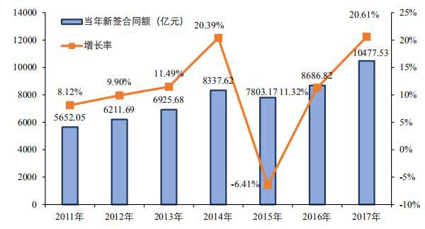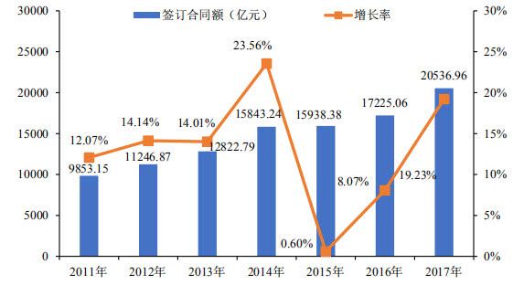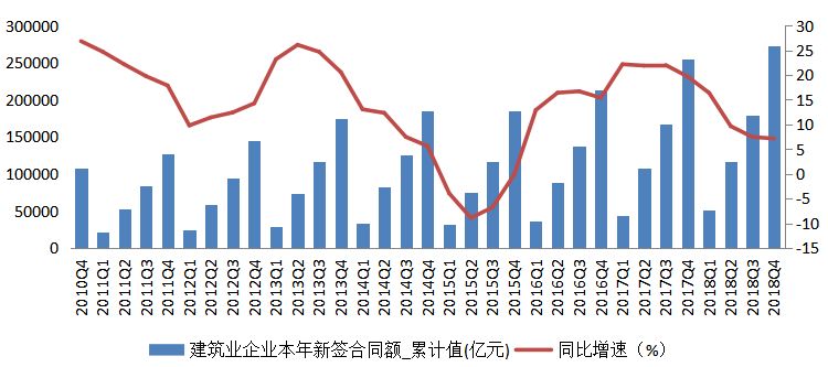 2018年建筑业新签订合同金额272854.07亿元,同比增长7.1%