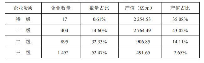 从资质等级来看,全省80家特级资质企业共完成产值10955.9亿元,同比增长19.7%,占建筑业总产值的32.2%,占比提升3.1个百分点;一级资质企业共完成产值13757.4亿元,同比增长7.1%,占比较去年同期提高3.2个百分点,占建筑业总产值的40.5%;二级资质企业共完成产值6362.2亿元,同比增长3.4%,占建筑业总产值的18.7%,较去年同期占比下降0.9个百分点;三级企业完成产值2978.4亿元,同比增长7.3%,占建筑业总产值的8.8%,与去年同期持平。
