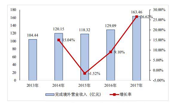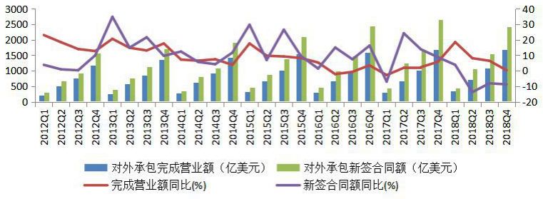 2019年1月16日,商务部合作司公布了2018年我国对外投资合作有关情况。2018年,我国对外承包工程业务完成营业额1.12万亿元人民币,同比下降1.7%(折合1690.4亿美元,同比增长0.3%),新签合同额1.6万亿元人民币,同比下降10.7%(折合2418亿美元,同比下降8.8%。