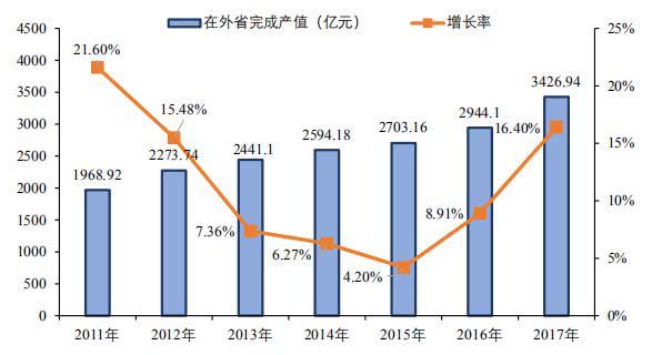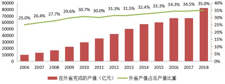 2018年省外产值82155.69亿元,占全国建筑业总产值比重为34.95%
