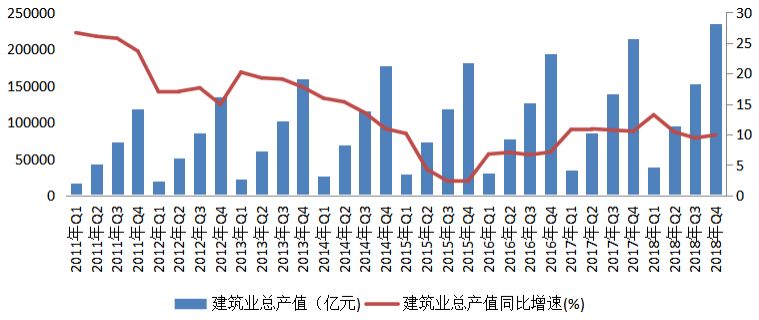 2018年全国建筑业总产值为235086亿元,与上年同期相比增长9.9%,增速自2015年跌入谷底后,稳步提升,自2017年第一季度开始,增幅虽有波动,但是保持在10%左右。全国建筑业房屋建筑施工面积140.9亿平方米,同比增长6.9%。