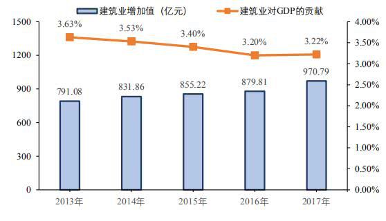 根据上海市统计局的数据,2017年上海市建筑业实现增加值970.79亿元,同比下降0.5%。上海市建筑业对上海GDP的贡献率为3.22%,同比增长0.02个百分点。