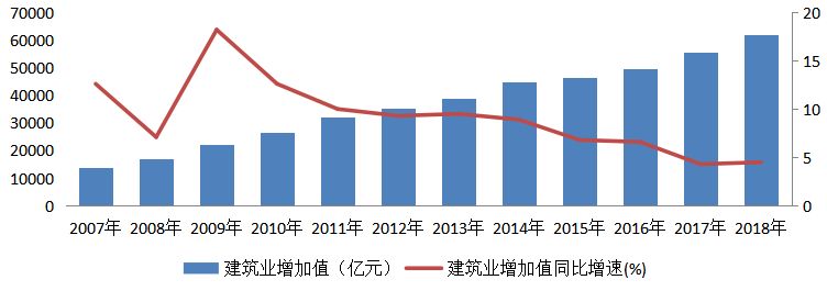 2018年全国建筑业增加值61808亿元,同比增长4.5%