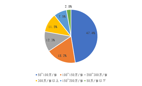 从地价分布来看,近两年上海产业用地地价主要集中在50~100万/亩,占比为47.4%,比例接近一半;其次为100~150万/亩,占比为18.2%;排在第三位的为200~300万/亩,占比为12.3%。