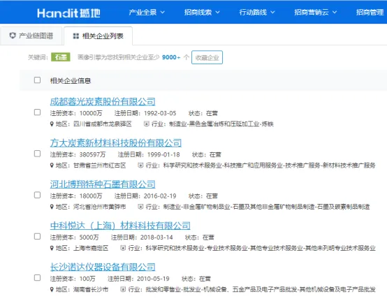 大数据依托全量企业数据库,通过企业的许可经营项目信息、专利信息、招投标信息、营销信息等多种维度通过算法判断企业对应的产业链环节,将企业对应到产业链图谱中,因此任意节点都可输出相关企业列表。图2为撼地大数据石墨产业链中“石墨”链点输出的企业列表,企业数量有9000+之多。因此,大数据可以有效解决产业链招商中的“找企业”问题,为地方政府或园区提供招商线索。
